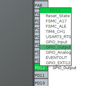 Now, go back to the Pinout & Configuration tab and set up the GPIO. Our goal is to blink LED D4, which is connected to PD12. To do this, click on the pin and select GPIO_Output from the list.