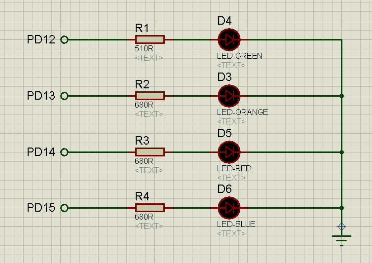 For this project, no additional wiring or soldering is required—everything is already available on the board. The LEDs are connected to PD12 – PD15, and we will use PD12 for blinking.