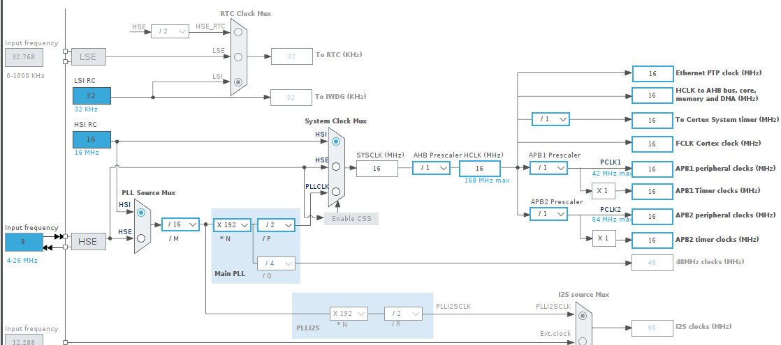 Next, go to Clock Configuration. Since we selected an external oscillator, set the HSE frequency to 8 MHz. ([Full breakdown of Clock Configuration in this article](link to article)). This will result in 16 MHz on the HCLK bus. For our project, this only affects the delay in HAL_Delay(1000);.