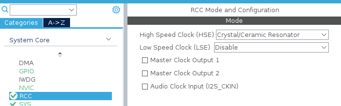 Let’s create our project. We covered how to create a project in [this article](link to article 1). Now, let’s configure the clock settings. To do this, go to the RCC tab and select the external oscillator.