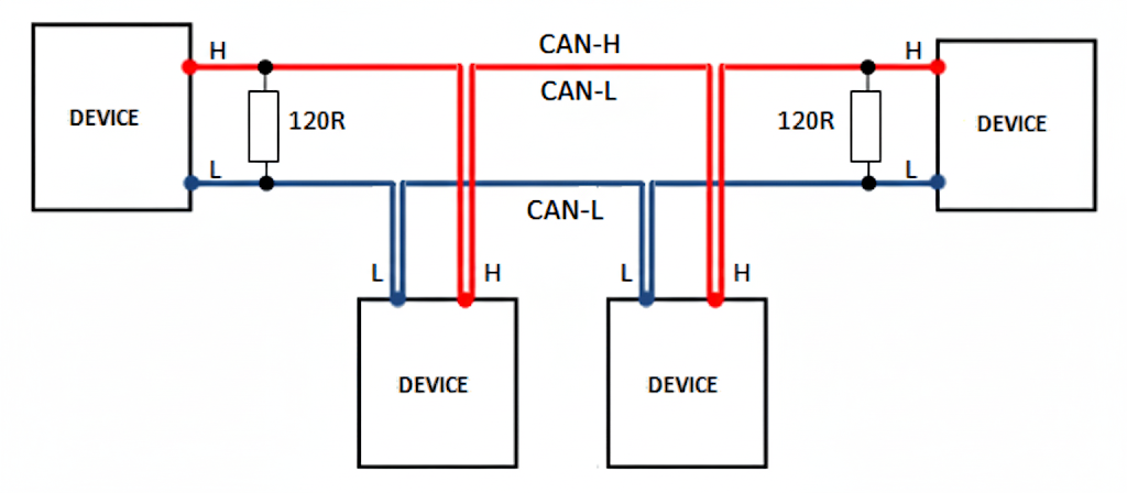 That’s basically the whole set. Only two resistors are needed for the entire line, and they must be 120 Ω. The rest of the hardware (microcontroller, CAN controller, transceiver) is required individually for each node.