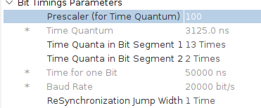 The first thing we need to configure is the Time Quantum (TQ). Time Quantum is the smallest unit of time used to measure the duration of different bit segments in the CAN protocol. Think of a bit as a segment divided into very small, equal-length “steps” or “quanta.” These “steps” are the Time Quanta. Each bit on the CAN bus is divided into several segments, each consisting of a certain number of Time Quanta.