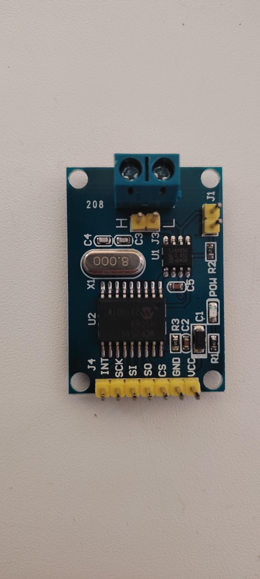 On the Arduino side, it’s a bit more complex. There is no built-in CAN controller, so we need an MCP2515 board. This is a standalone CAN controller developed by Microchip. It handles all CAN bus logic tasks (frame formatting, ACK, CRC, arbitration, etc.). The board also includes a TJA1050 transceiver to convert logic levels into the differential signals of the CAN bus. The MCP2515 board connects to the Arduino Uno via the SPI interface.