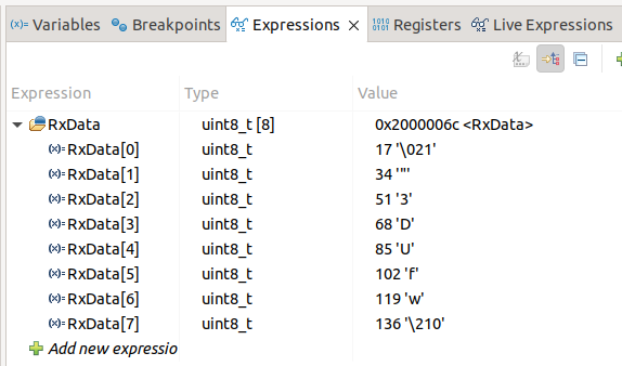 Add RxData to Expressions and set a breakpoint at the end of the HAL_CAN_RxFifo0MsgPendingCallback function. Start the debugging. The green LED on the Discovery board should light up, and in Expressions we should see the following.