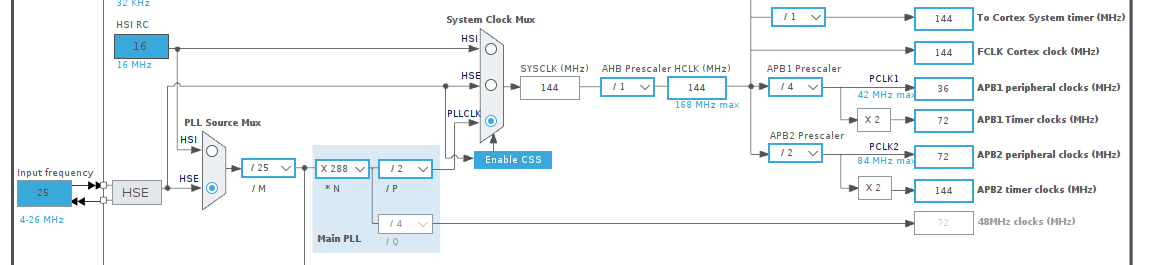 Next, in the PLL, we need to obtain 144 MHz from a 25 MHz input frequency. Set the following parameters: