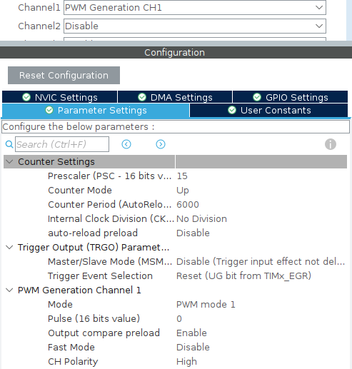 In the timer settings, select PWM Generation CH1 to generate hardware PWM and apply the following settings: