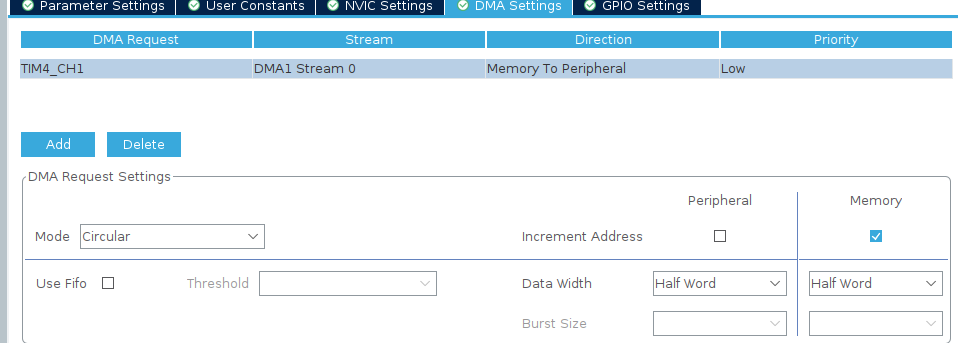 Add a DMA request. Click the Add button. Select DMA Request — TIM4_CH1.