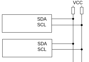 Each device connects its pins to the pins with the same name of other devices. Up to 127 devices can be on one bus. Pull-up resistors are mandatory for the device to work.