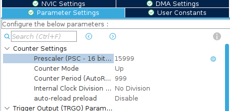Set the Prescaler value to 15999 and the Counter period to 999.