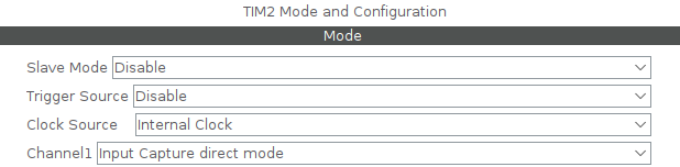 Let’s look at how both of these types of interrupts can be used in real-world applications.The task is as follows: using compare interrupts, make an LED on the board blink with a period of one second. We will use Timer 2 on the STM32F407VGT6 microcontroller.The first configuration is the clock source. Go to the timer settings (Timers-TIM2), locate the Clock Source option, and select Internal Clock. We will use the first channel in Input Capture Direct mode.