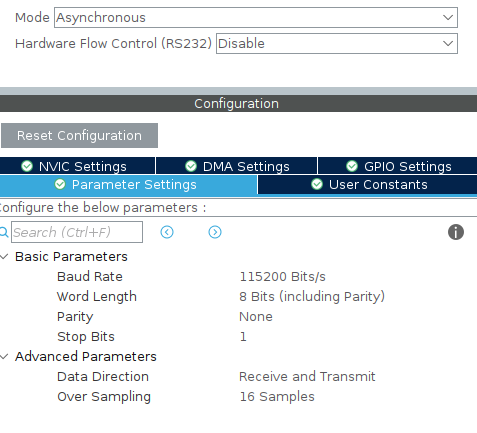 We are working in CubeIDE. The configuration is standard: asynchronous mode, 115200 bit/s baud rate, 8-bit data length, no parity bit, and one stop bit.