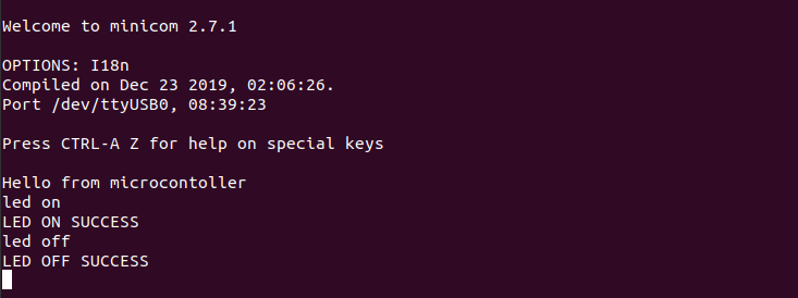Open our minicom terminal. We can see that the string “Hello from microcontroller” has arrived immediately. To be able to type commands, we need to enable echo mode. Press Ctrl + A, then Z to open the menu, and press E. Echo mode is now enabled, and we can enter our commands. Try typing led on, and the LED lights up while the terminal displays a message confirming the command was executed successfully.