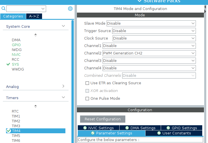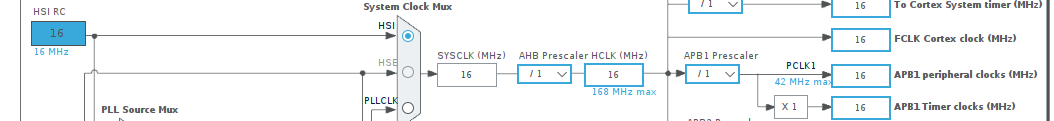 For software PWM implementation, we will use Timer 2, which is on the APB1 bus. We will use the internal generator with no prescalers, thus achieving a frequency of 16 MHz on the APB1 bus.
