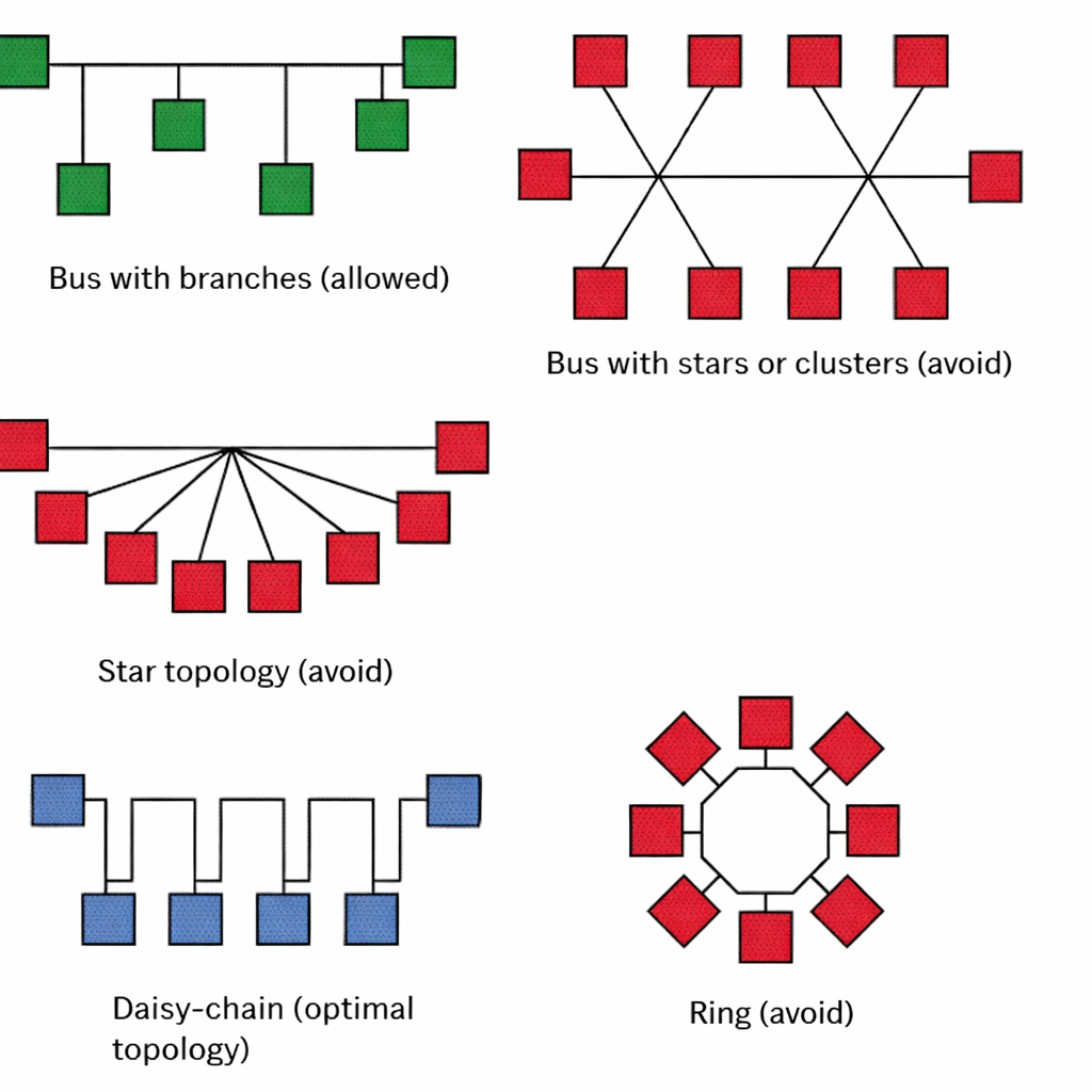 If a network operates at low data rates, with relatively slow signal edges and short cable segments, topology is not critical. However, as the line length increases, data rates rise, or interference appears, topology becomes crucial. In such cases, the only simple and reliable way to control signal reflections is a daisy-chain connection, where devices are connected sequentially along the line.