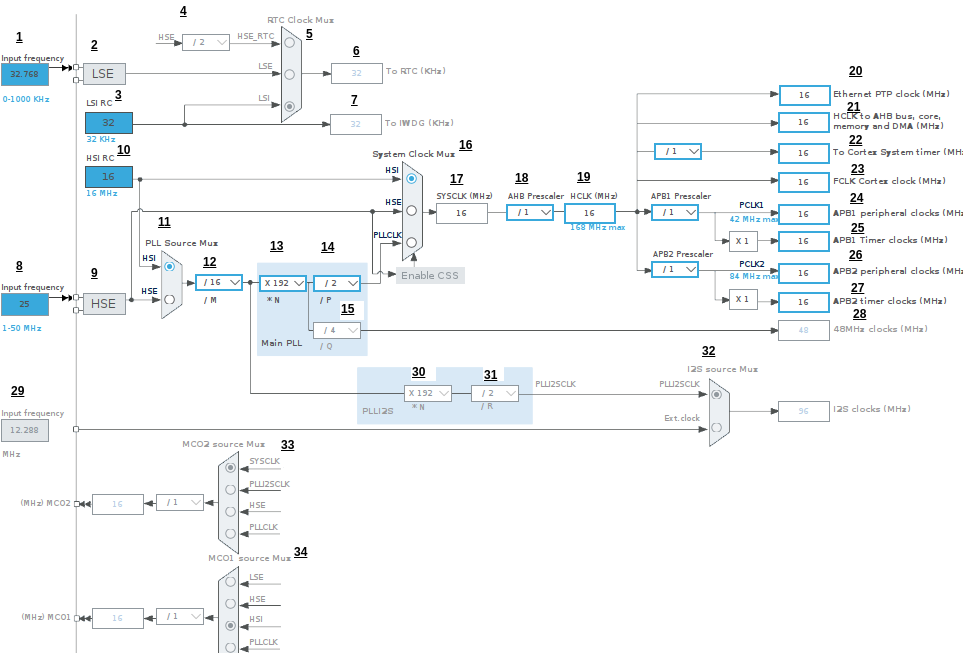 16 — System Clock Mux это мультиплексор, который выбирает основной источник тактового сигнала для системной частоты fSYSCLKf. Это ключевая настройка, так как fSYSCLKf используется для работы ядра процессора. Имеет три варианта выбора HSI HSE PLLCLK. А так же систему защиты тактового сигнала (Clock Security System, CSS). .Она предназначена для автоматического переключения на резервный источник тактового сигнала в случае сбоя основного.Включение CSS позволяет избежать аварийной остановки микроконтроллера при сбое внешнего кварцевого резонатора (HSE). ( Для включения CSS кликните по блоку )