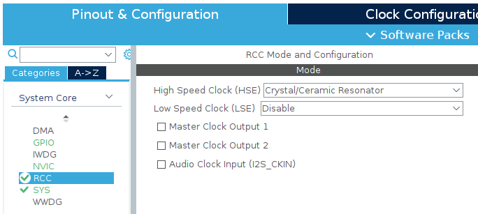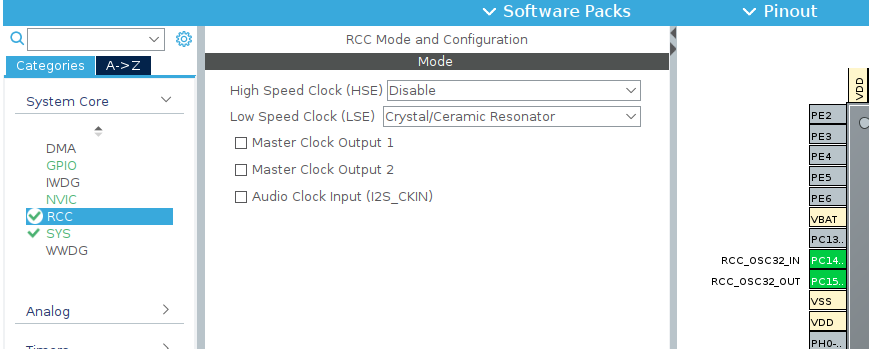 Пару слов о настройках внешнего тактового сигнала. Чтобы включить возможность использовать внешний сигнал необходимо в настройках System Core в закладке RCC в строке Low Speed Clock выбрать Crystal/Ceramic Resonator или BYPASS Clock Source. Если вы работаете с RTC и подключаете стандартный кварцевый резонатор 32.768 кГц, вам нужно выбрать Crystal/Ceramic Resonator.Если у вас нестандартный проект, где частота приходит с внешнего генератора (например, сигнал от другой микросхемы), выберите LSE Bypass Clock Source. При этом становятся активными выводы PC14 PC15.