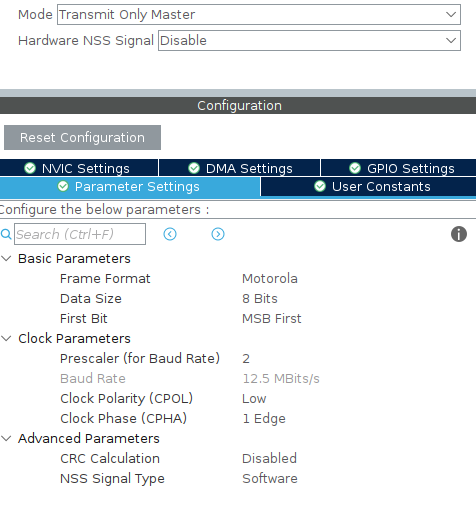 We set the Prescaler to 2, which results in a baud rate of 12.5 Mbits/s.