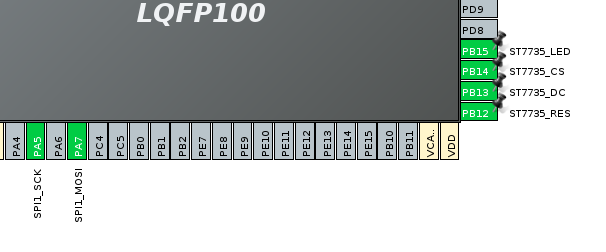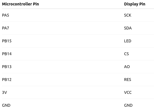 Pin PA5 is connected to the display’s SCK pin and is responsible for the SPI clock signal, while PA7 is connected to the SDA pin, handling data transmission. Pin PB15 controls the display’s backlight and connects to the LED pin. Pin PB14 is used for chip select (CS). Pin PB13 connects to the AO pin, which determines the transmission mode—command or data; for sending data to the display, this pin is set to a high level. Pin PB12 connects to the RES pin and is used for the hardware reset of the display. Additionally, 3.3V power must be supplied to the VCC pin, and the microcontroller’s ground (GND) must be connected to the display’s ground. The display’s CS pin is not needed in this setup because there is only one display connected.