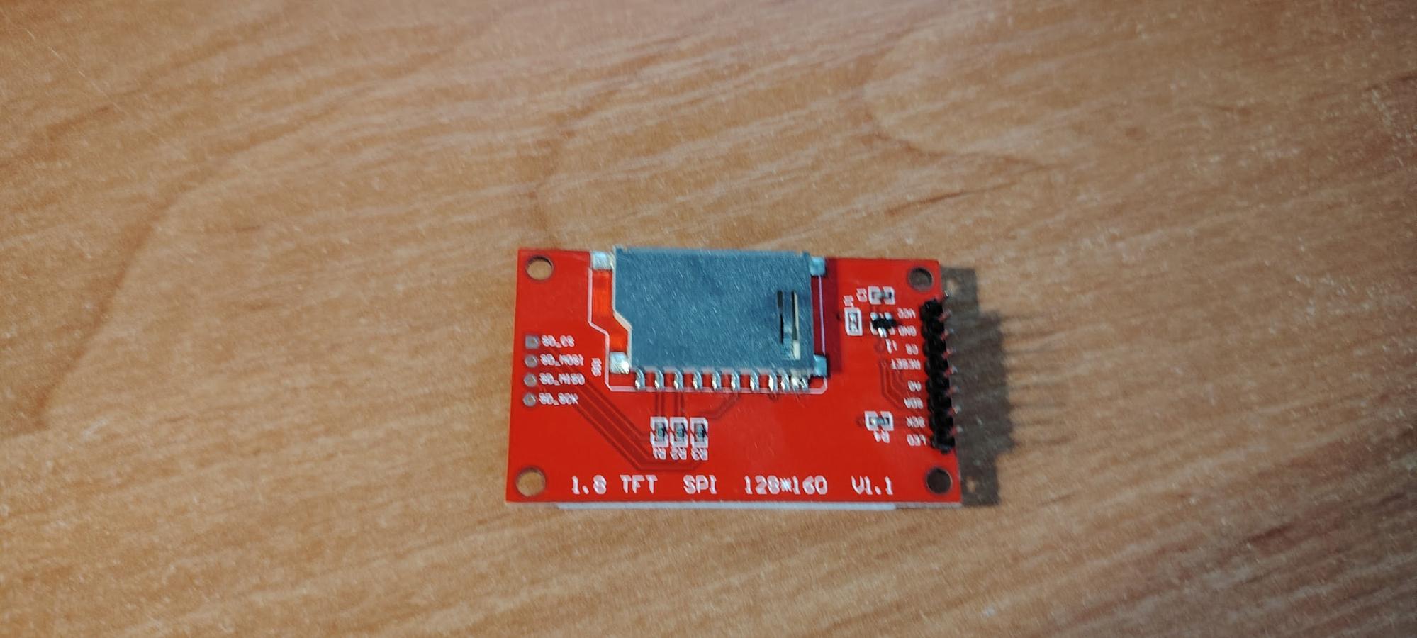The display is used to output data from your microcontroller. It features a 1.8-inch diagonal with a resolution of 128×160 pixels. The display uses a TFT LCD (Thin-Film Transistor Liquid Crystal Display) matrix. One of its advantages is the SPI interface, which requires only a few pins for connection. It also includes a built-in backlight and has ready-to-use libraries available for development. The display operates at 3.3V, which is standard for microcontrollers.