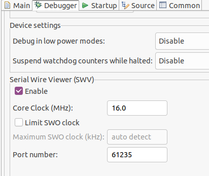 Then go to Debug Configuration, enable SWV – Enable, and select the frequency (it must match the actual core frequency).