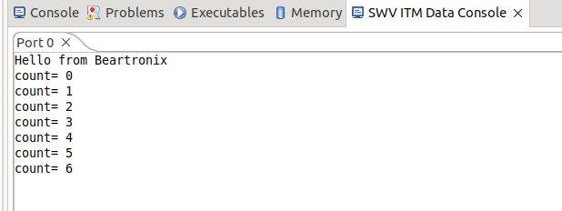 /* USER CODE BEGIN 2 */ printf("Hello from Beartronix\n"); /* USER CODE END 2 */ /* Infinite loop */ /* USER CODE BEGIN WHILE */ while (1) { printf("count= %d\n", count); count++; HAL_Delay(1000); /* USER CODE END WHILE */ /* USER CODE BEGIN 3 */ } /* USER CODE END 3 */ }